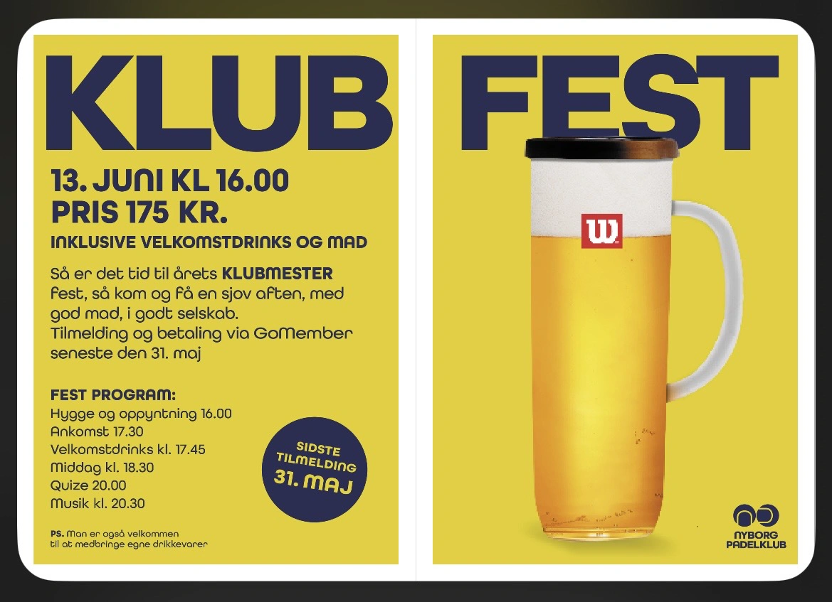 Finalen i klubmesterskabet afholdes lørdag d. 13. juni med efterfølgende fest. Venligst se vedhæftede og evt. på vores Facebook. Vi håber rigtig mange vil deltage, det plejer at være rigtig sjovt og hyggeligt. Tilmelding via Gomember.